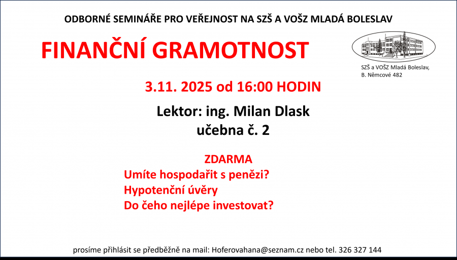 Naše škola zve všechny zájemce na další z odborných seminářů pro veřejnost, tentokrát na téma Finanční gramotnost. Seminář povede Ing. Milan Dlask a uskuteční se v pondělí 3. listopadu 2025 od 16:00 v učebně č. 2. Účast je zdarma, prosíme však o předběžné přihlášení e-mailem nebo telefonicky.
