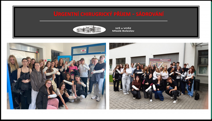 Studentky oboru Praktická sestra z tříd 1.PA a 1.PB navštívily v rámci teoretické odborné výuky urgentní chirurgický příjem, kde si měly možnost prakticky vyzkoušet techniku sádrování. Děkujeme staniční sestře i celému personálu ambulance za ochotu, vstřícnost a odborný výklad.
