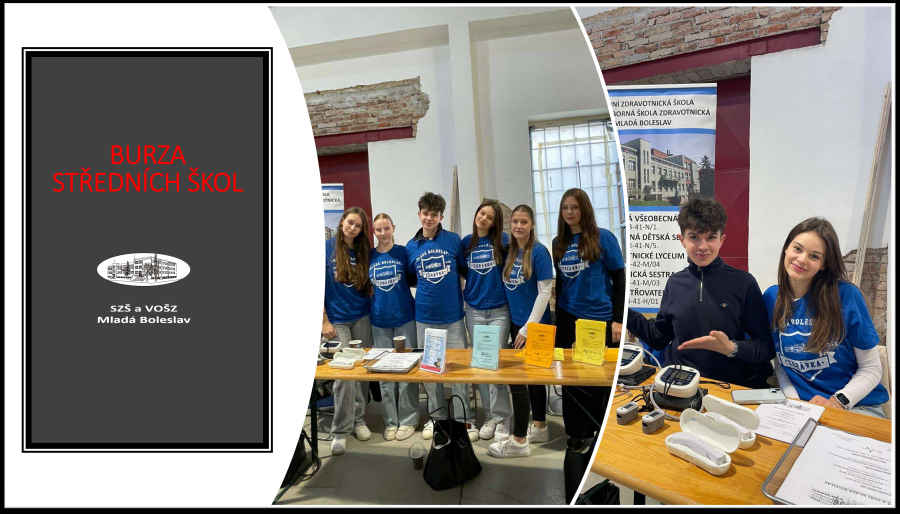 V pondělí 13. 10. 2025 proběhla na Pluhárně tradiční burza středních škol a učilišť pořádaná parlamentem města Mladá Boleslav. Naši školu skvěle reprezentovaly studentky oboru Praktická sestra – Jana, Lenka, Kristýna a Daniela – spolu s lyceisty Emou a Kryštofem. Děkujeme za vzornou prezentaci školy a jejich vstřícný přístup k budoucím uchazečům.